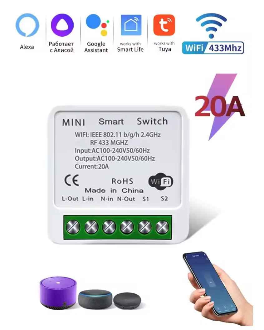 مينى سويتش 1 خط تويا 20 امبير مع ار اف 433 -mini switch 1 gang tuya 20A RF433